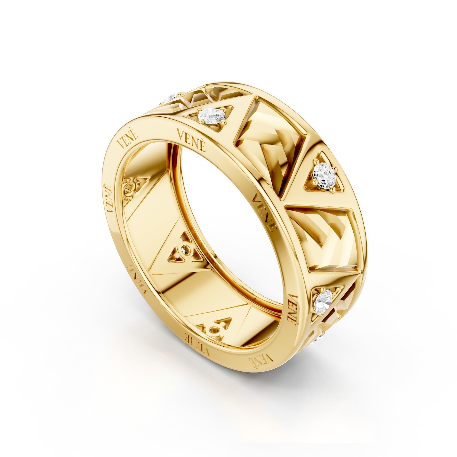 Vetra ring is a bold expression of modern elegance. Crafted in luminous gold, its sculpted geometric pattern creates depth and movement, while the subtle diamond accents add a refined touch of brilliance.